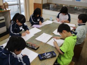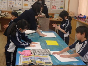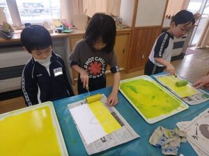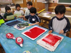 1年生 図画工作科 黒部市美術館出前授業 2026年1月21日 1年生 1月20日(火)に、黒部市美術館の講師の先生2名をお招きして、「スチレンボード版画」を製作しました。スチレンボードに鉛筆で絵を描いてへこみを作り、選んだ色をボードに付けて画用紙に写しました。ローラーにインクを付けて転がす作業を、とても楽しそうに行っていました。1つ1つの作業を丁寧に行い、それぞれ素敵な作品が出来上がりました。