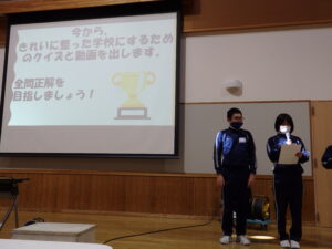 今回は、「学校をきれいにするために、自分にできることをしっかりしよう」のめあてのもと、美化委員会が発表をしました。映像を使ったクイズを通して、ちょっとの意識で学校をきれいにできることが分かりました。また、掃除用具の片付け方を確認したりすることができました。