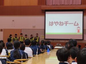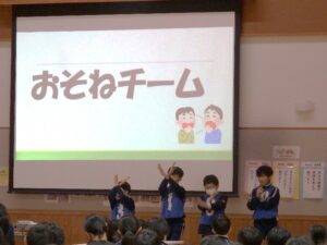 保健委員会の発表では、「はやねチーム」と「おそねチーム」に分かれて、よく眠るよさや、寝不足のときの体の不調について全校に伝えました。また、1学期に行った生活見直しウィークの集計結果を報告しました。