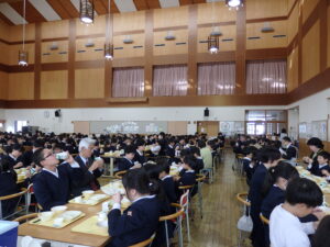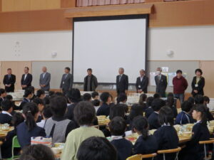 11月18日(火)は、黒部市地場産学校給食の日でした。お米の生産者の方や来賓の方々をお迎えして、ふれあい会食として、黒部の恵みを一緒に味わいました。