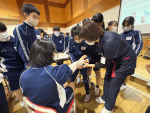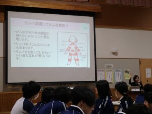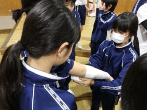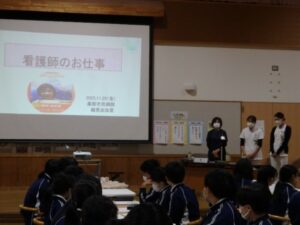 11月28日(金)、総合的な学習の時間「描こう!未来の自分」の学習で、6年生が黒部市民病院の看護師の方をお招きし、お話を伺いました。看護師の仕事について教えていただいたり、リンパ腫の患者さんに行う圧迫療法を体験したりしました。子供たちは、動画を見て、がんになる仕組みを知って驚いたり、包帯やスリーブを使った療法体験から、看護師さんの対応の正確さと優しさを感じたりしていました。また、看護師さんは、患者さんやその家族からの「ありがとう」の言葉で、うれしくなったり、がんばろうという気持ちになったりするということを知って、大変な仕事の中でも、やりがいを感じて仕事をされていることを感じていました。